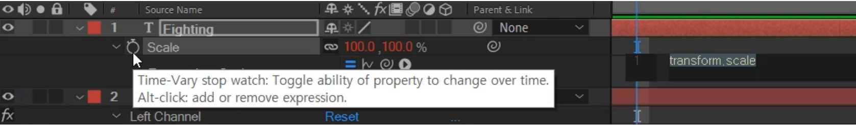03 움직이려는 레이어를 선택하고 크기 변화는 S, 회전의 경우는 R을 누르고 준비만 한다. 그리고, 스톱워치를 Alt키를 먼저 누르면서 클릭을 하면 스크립트인 표현식 익스프레션(Expression) 추가되어 진다.