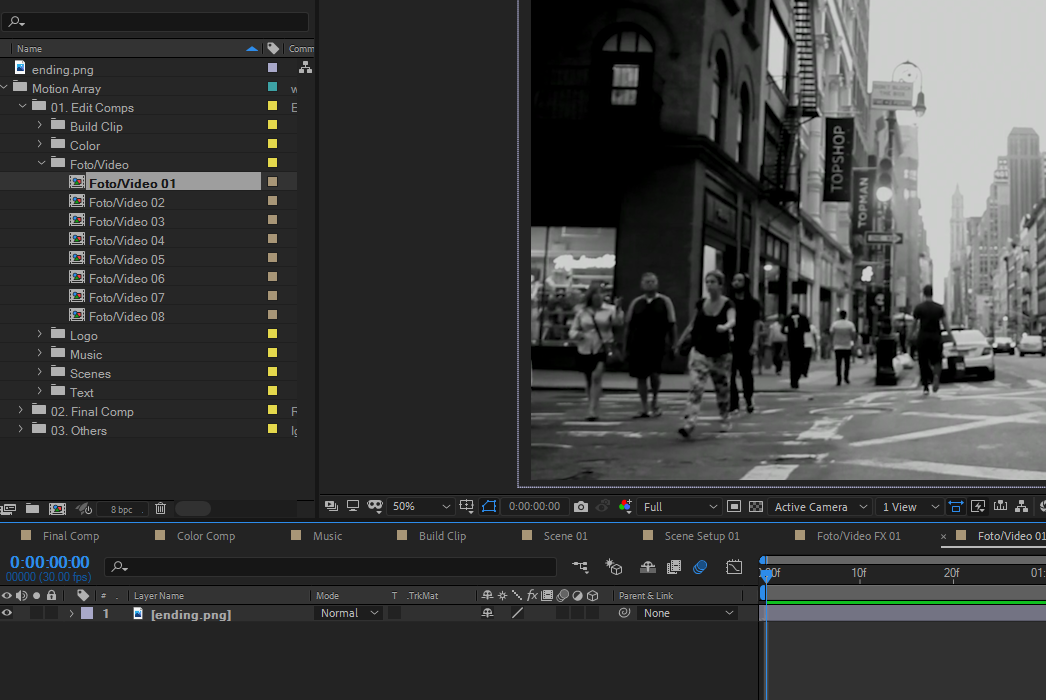 프로젝트를 펼치면, Edit Comps-FotoVideo에는 이미지를 Bulidclip에는 계단식 배열이 보여지고 하나하나 이미지를 교체하여 진행합니다.