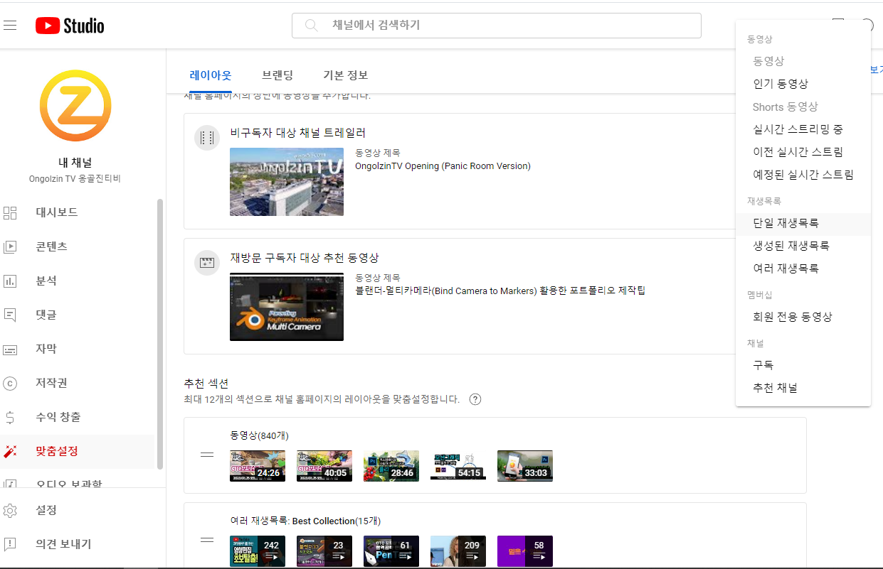 채널 맞춤설정 - 섹션꾸미기