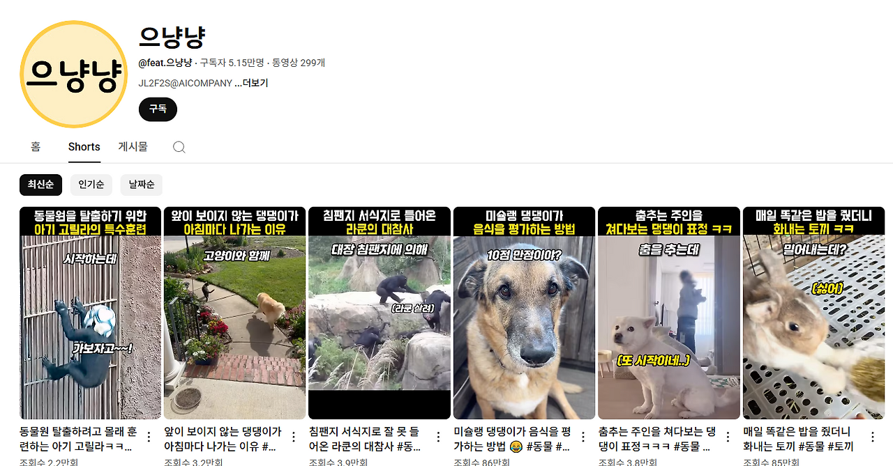 익숙한 목소리의 유튜브크리에이터의 동물관련된 쇼츠만 올리는 채널입니다.