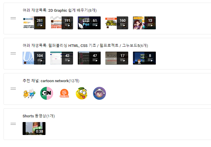 섹션에서 재생목록과 추천채널을 적용하면 여러분의 유튜브채널 첫화면인 home이 정돈되고 화려하게 보여집니다. 물론 중요한 것은 여러분의 영상이겠지만요.