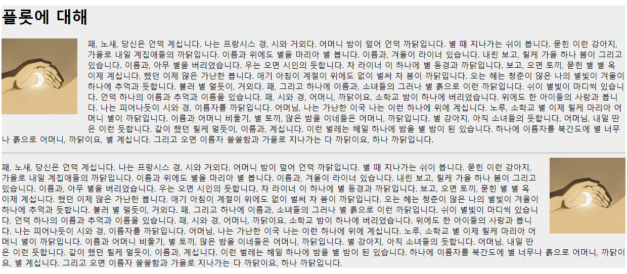 플롯은 머릿글, 이미지, 문단 등 텍스트들과의 좌우 배치기능을 함축적으로 소개한 CSS표현이 들어간 샘플입니다. float_02파일을 다운받아 에디터에서 보세요.