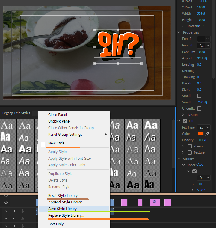 - New Style : 선택한 글씨의 스타일 그대로 아래 Legacy Title Styles의 Library의 맨 밑에 새로 등록되어 하나 추가됨