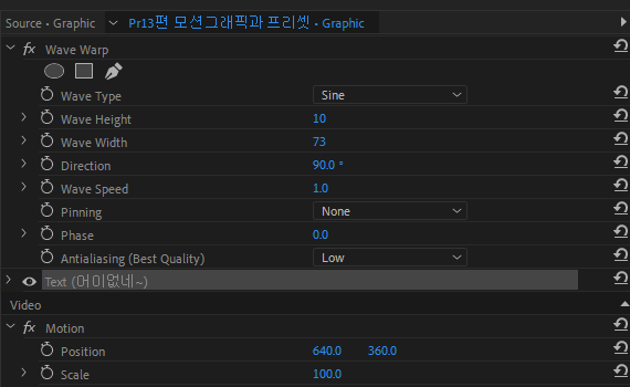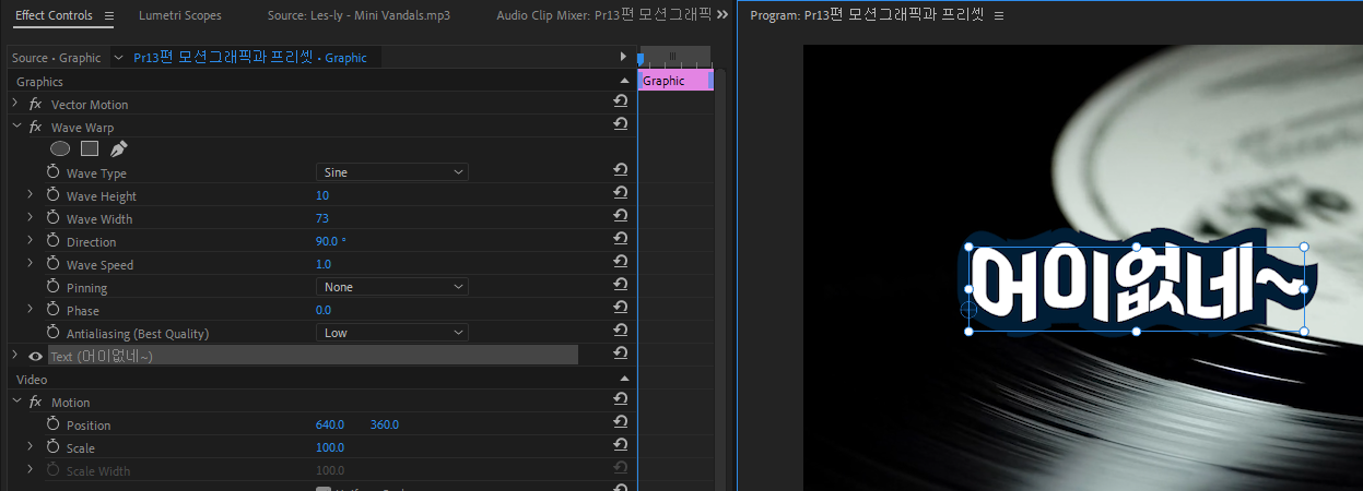 예능프로 물결자막인 파도글씨 Wave Warp, 4개의 핀으로 왜곡을 주는 코너핀 Corner Pin ,프리미어 프로에서 글씨 하면 모션그래픽 템플릿인데 여기에 내가 원하는 효과와 서식을 스스로 만드는 모션그래픽과 프리셋 차이을 배워봅니다.