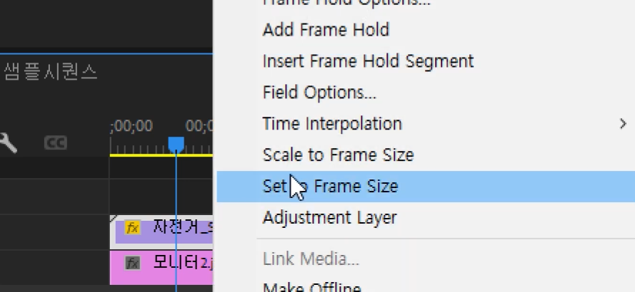 01. 모니터2 이미지를 V1에, V2에 자전거 영상을 배치합니다. 만일 영상크기와 비율에 맞지 얺는 경우는 우클릭 후 Scale to Frame Size를 통해 시퀀스 프레임 크기에 맞춰 줍니다. Effect Control패널의 Motion을 통해 영상크기를 줄이는 방식도 가능합니다.