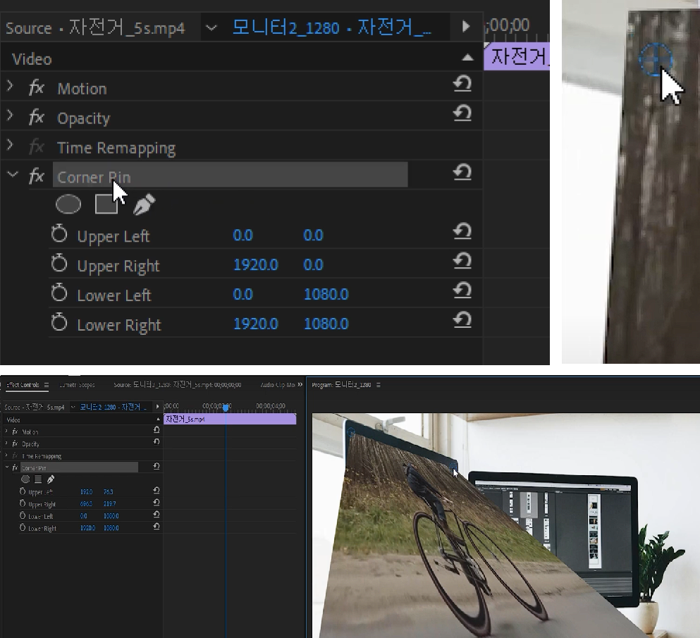 왼쪽 모니터 속 코너핀(Corner pin)은 한국어 버전에서는 모퉁이 고정이라고 기가막힌 한국식 번역을 했습니다. 모퉁이 고정 효과라는 이름을 누르면 4개의 사각틀 모서리의 핀으로 자유변형을 줄 수 있습니다.