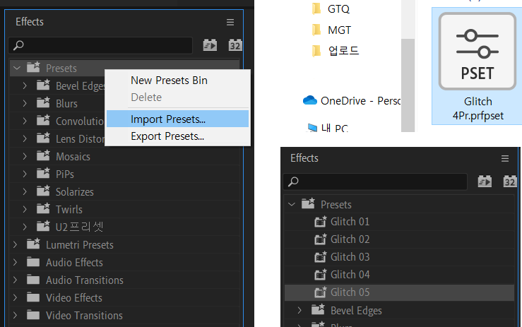 프리셋은 Effect controls에 사용한 기본적인 효과인 Motion / Opacity 외에 추가적인 Effect를 포함하고 있는 효과를 다른 비디오클립에도 적용할 수 있게 Effect창에 등록하는 것을 말합니다. 아래 파일로 Effect창 우측상단의 햄버거버튼누르고 Import Preset하면 아래 내용을 추가할 수 있습니다.