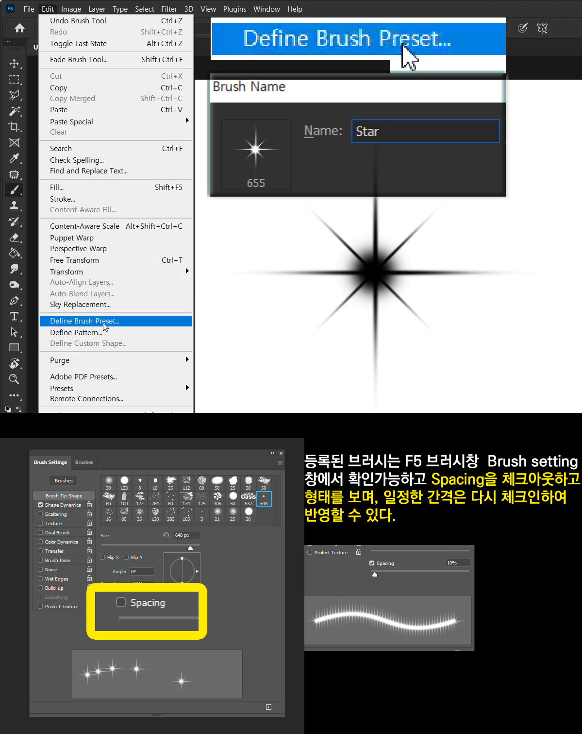 포토샵에서 별, 빛 브러시 등록은 Edit-Define Brush Preset으로 합니다. 빛이라도 대상은 검은 색으로 붓의 형상을 만들어 브러드 등록의 대상이 됩니다. 별모양 생성하는 단계는 2단계의 등록을 통하며, Brush(F5) 둘레를 찌그림 5% 가로,세로 회전 십자형 생성 후, 1차등록하고 등록된 붓을 45도로 회전후 작게 안쪽빛 그림(검은색) 거기에 둥근 작은 붓으로 터치후 최종 2차 등록을 별 형태로 등록했습니다.