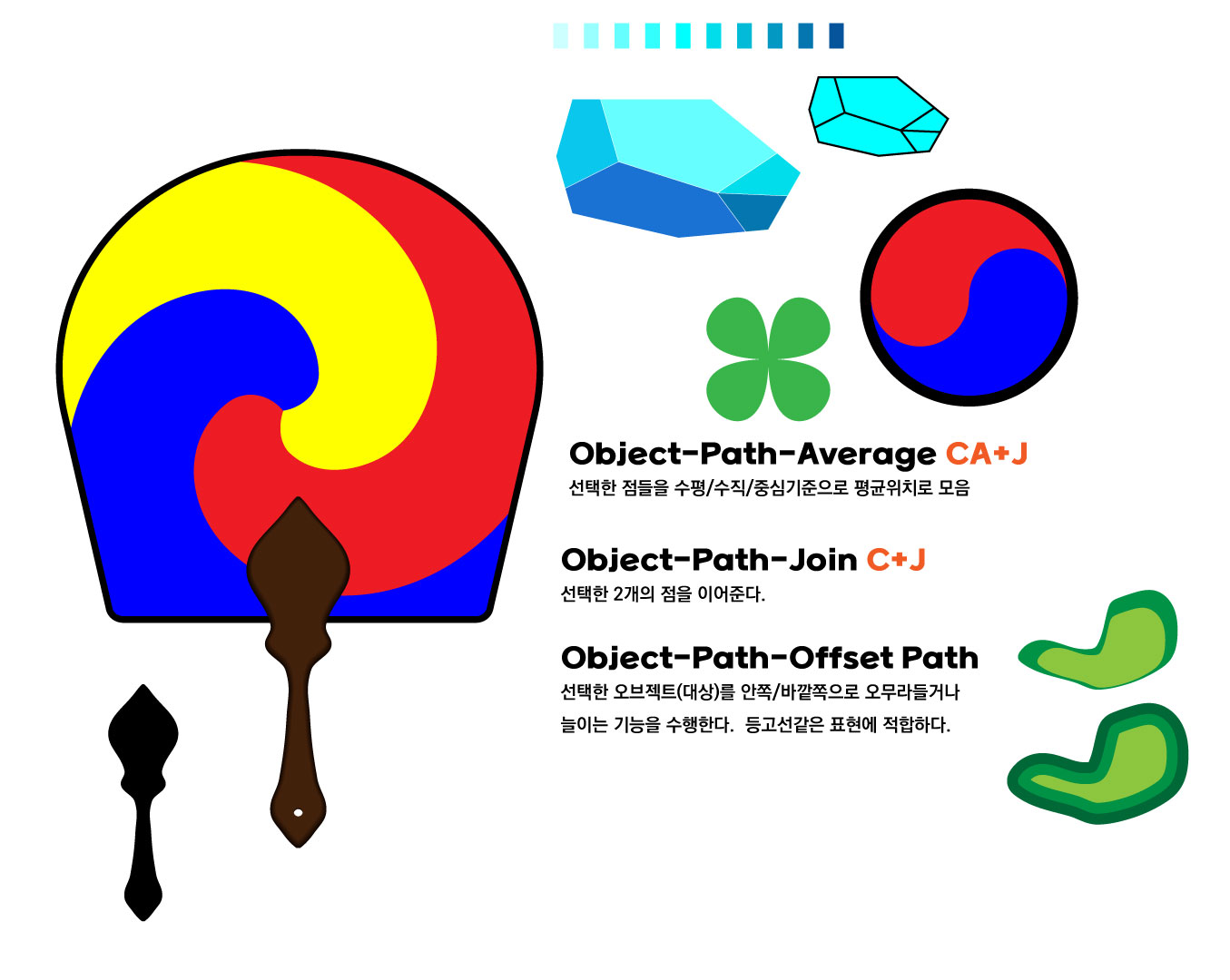 일러스트레이터로 그리드 환경인 그리드 보기(C+")와 그리드 잠그기(CS+")에서 선을 1개 그리고 120도로 회전복제를 하고, Twirl이라는 도구의 옵션조절로 회오리형태로 돌린 선을 태극부채의 형상을 Pathfinder의 분리기능으로 나누어 대극부채를 그리는 표현방법을 소개합니다.