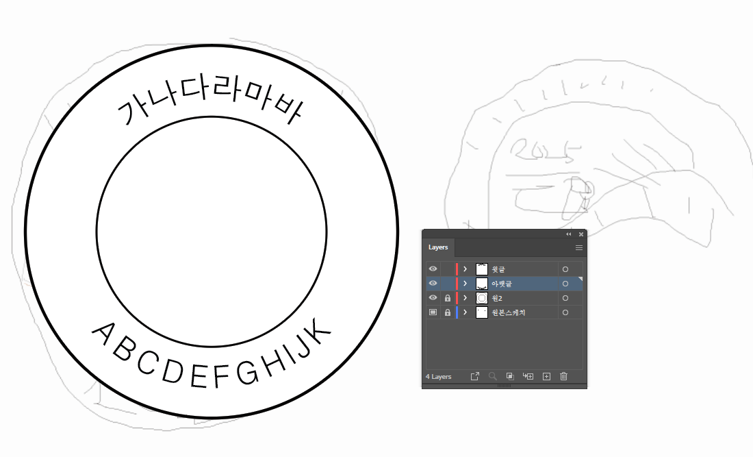 특정한 로고에 원형태로 국문/영문으로 구분되는 앰블럼 디자인도 로고디자인에 해당되는 경우가 많습니다. 여러분이 원을 그리고 각 레이어별로 원의 라인을 따라 글씨를 중앙정렬로 놓고 바깥쪽에 국문을 표현하고 다른 레이어에는 복제된 국문 경로글씨를 영어로 바꾸어 작성 후 안쪽으로 뒤짚어 표현하면 앰블럼을 만들 수 있습니다.