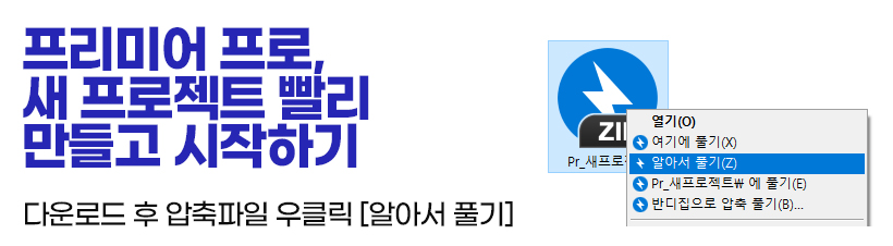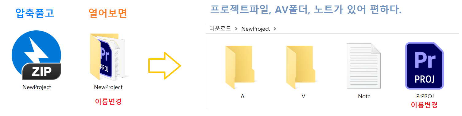 프리미어에서 매번 새프로젝트 만드는 경우에 절차가 복잡합니다. 여러분도 새로만들기-메모장,한글문서,MS워드처럼 쉽게 프리미어 프로젝트 파일을 만들고 싶다면, 대체방법으로 아래 압축파일을 첨부하니 다운로드 후 압축풀고, 폴더내에 비디오/오디오 등을 폴더로 구분해서 준비하고 NewProject파일을 더블클릭해서 빠르게 새 프로젝트를 시작할 수 있습니다.