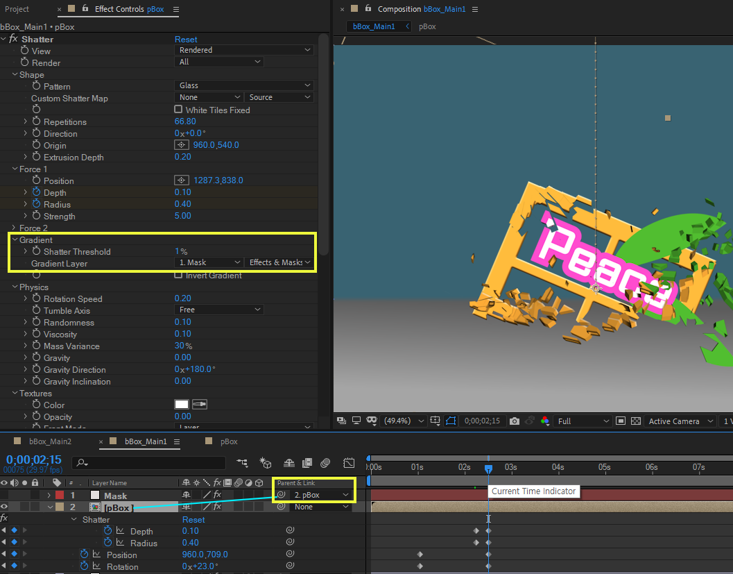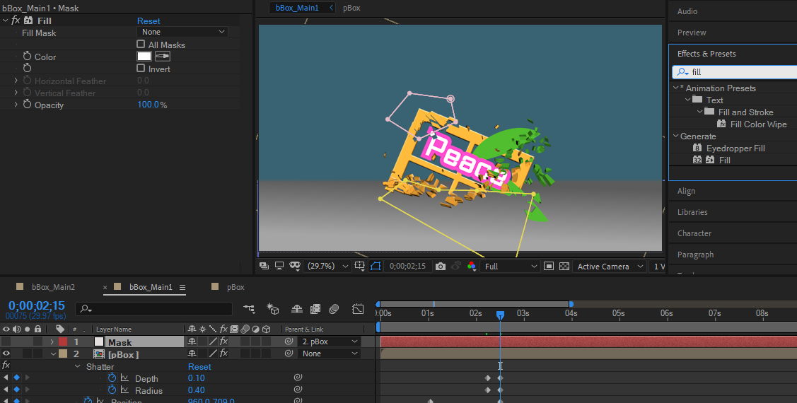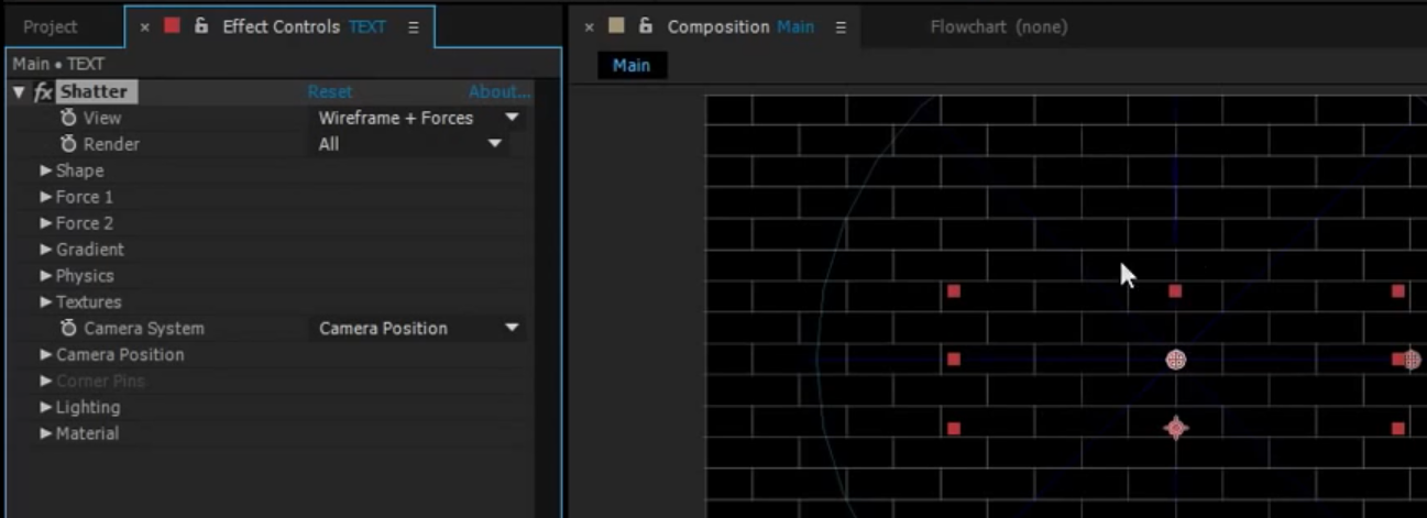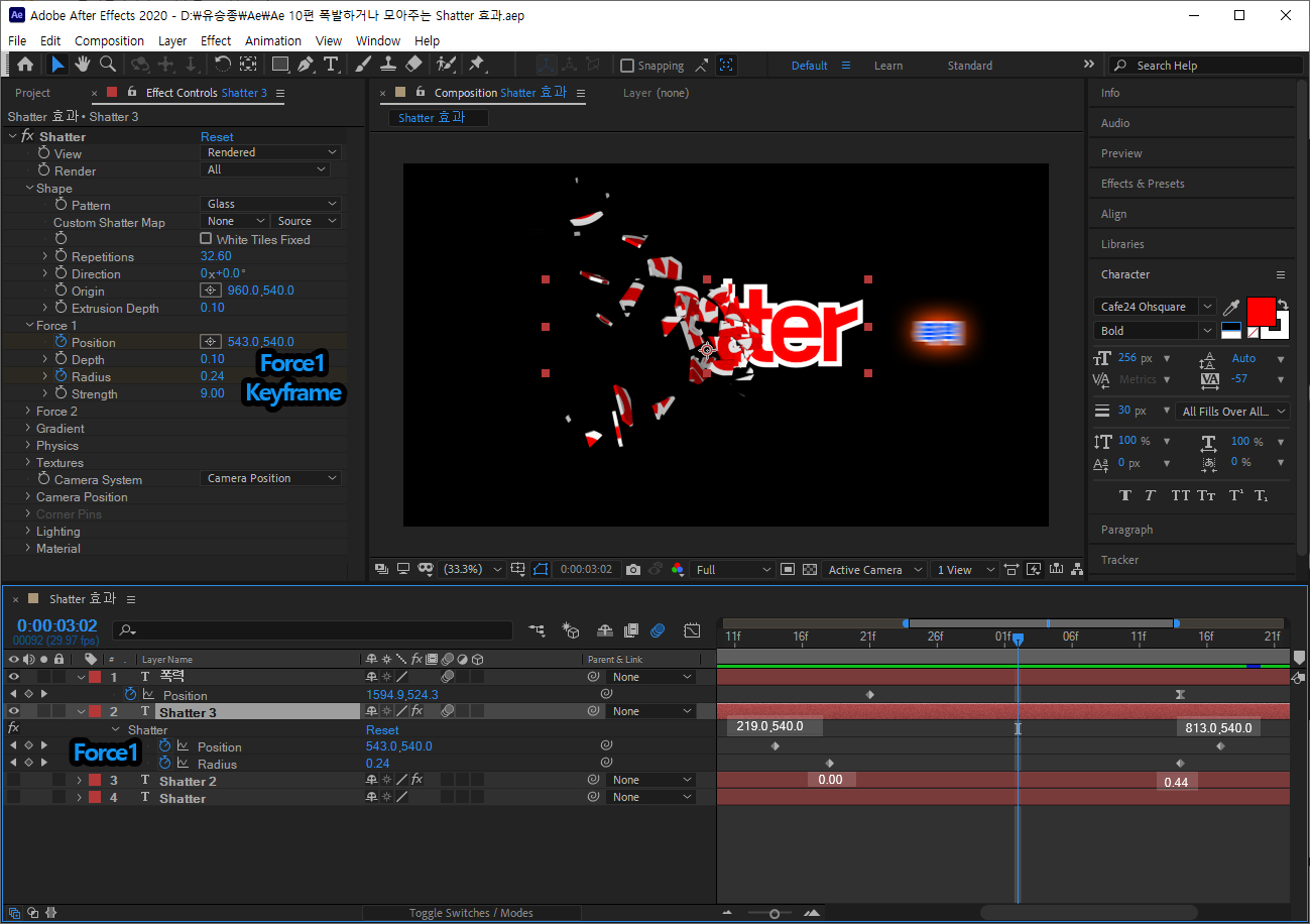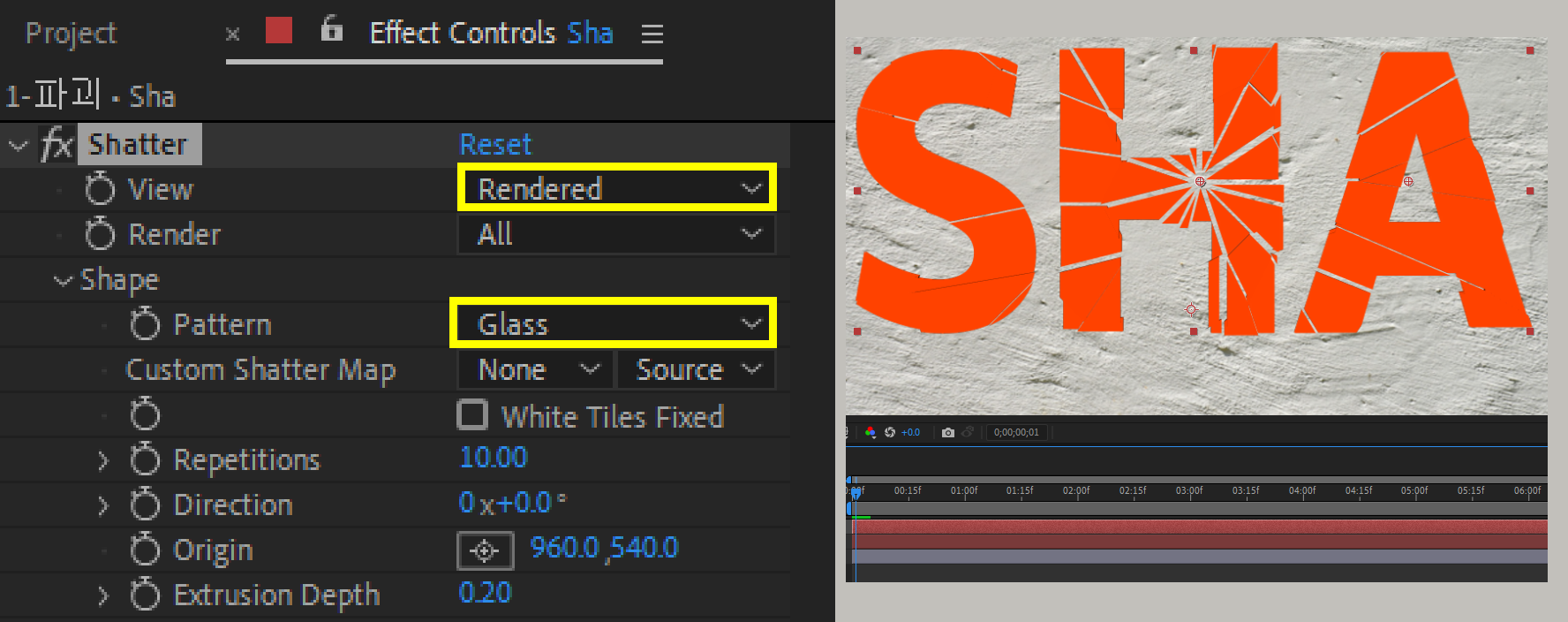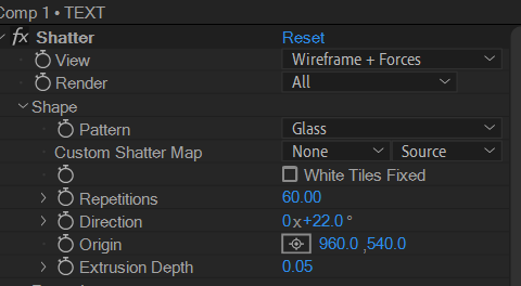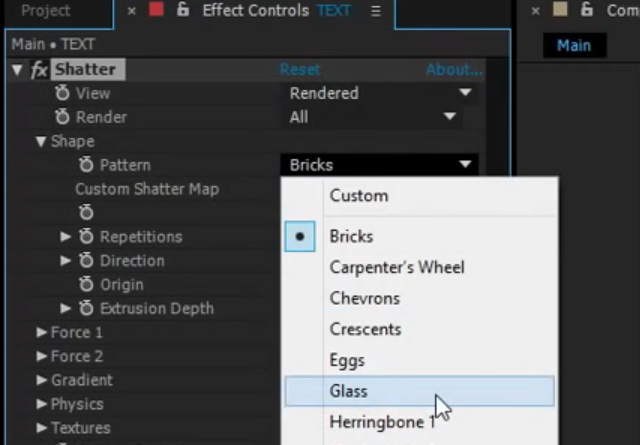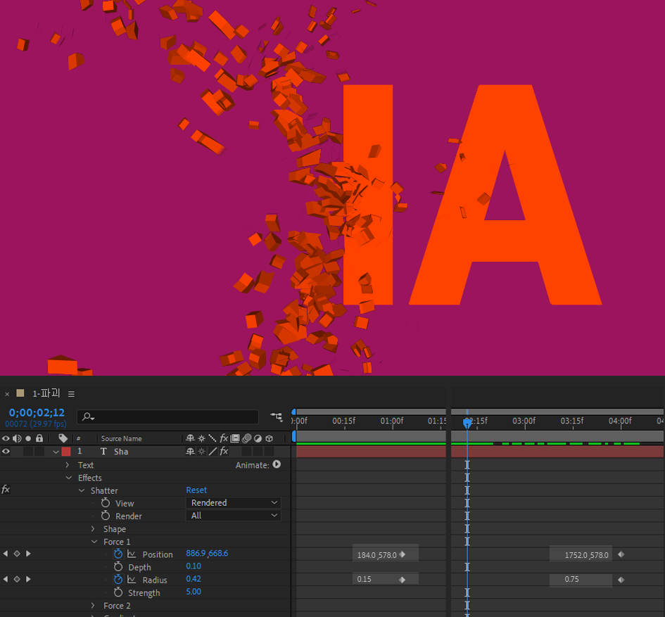 01. 텍스트를 입력하고, Effects에서 검색으로 Shatter 를 찾아서 적용한다.