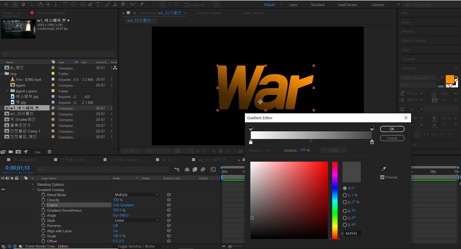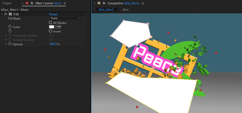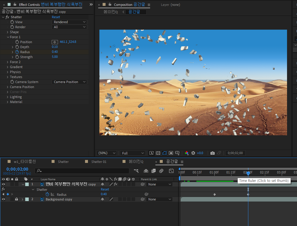 샤더 효과를 적용하면 전체가 다 부서진다. 일부만 부셔지는 표현을 위해서는 별도의 기존에 사용하던 마스크와 다른 일부만 보이는 부분적인 효과적용을 위한 솔리드레이어를 이용한다.