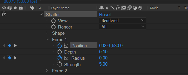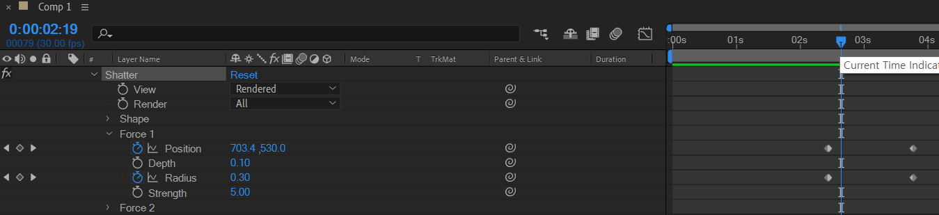 Force1의 Positon과 Radius값의 키프레임 적용을 확대해서 본 그림이다.