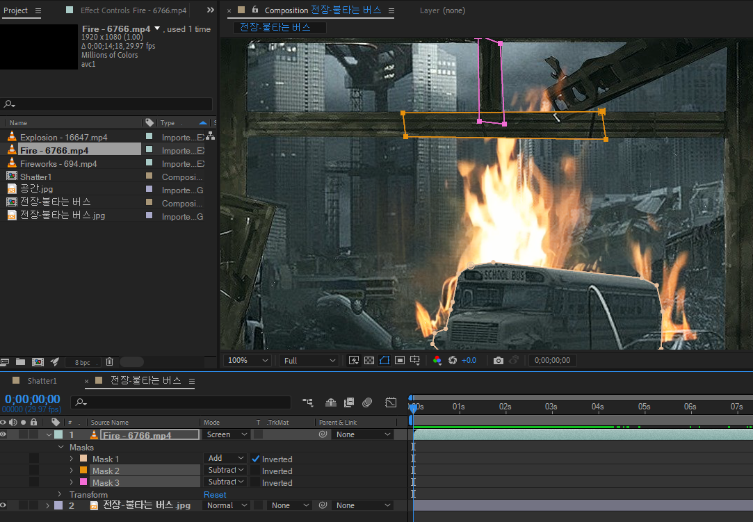 불의 범위를 버스만큼만 마스크 범위를 정하고Add, Inverted 체크해서 반대 불 표현 / 창틀은 필요만큼 정하고 Subtract처리를 했습니다.