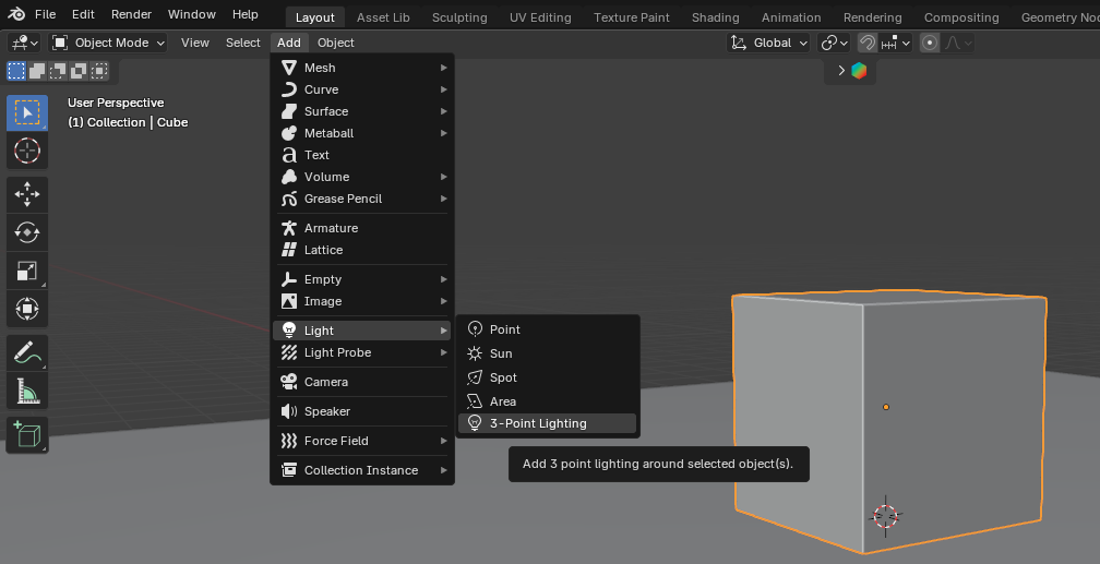 사용법은 큐브등 주인공인 오브젝트를 선택(큐브외 여러분이 원하는 주연급 대상)한 후 Add에서 Light 항목에서 3-Point Lighting을 추가하면 선택된 활성 객체에 촛점을 맞춘 3점 조명을 추가됩니다.