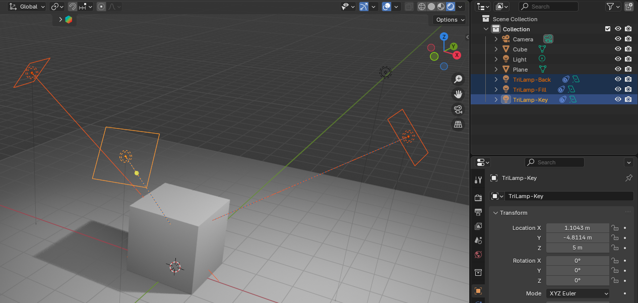 비디오 렌더링에 최적화된 EEVEE에서 기본조명 1개과 애드온 Tri-lighting이 설치되어 추가한 3-Point-Lighting라는 조명이 처리된 렌더미리보기에서의 2개 이미지를 비교 해보세요. 어두운 부분을 보완하는 보조조명들이 단순한 기본조명 1개의 어색함을 보완 해줍니다.