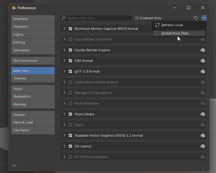 BlenderKit을 다운로드 했으면 절대 압축풀지말고 바로 그 파일로 설치를 진행합니다. 우측의 ▼를 누르고 Install from Disk... 를 누른 후 ZIP파일을 찾아 선택합니다.