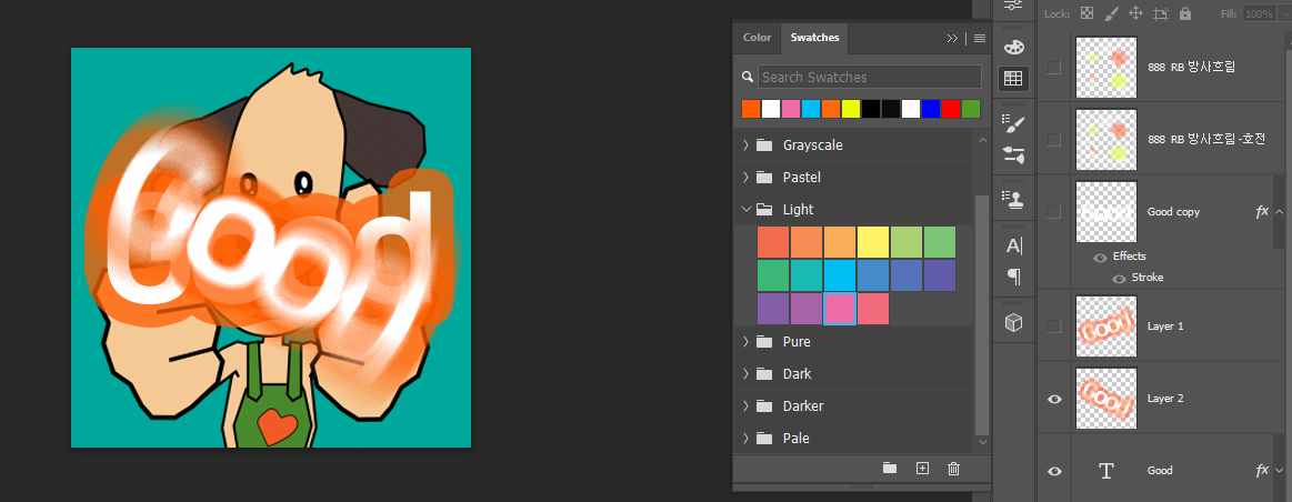 필터(Filter) 메뉴에서 Blur - Motion Blur(모션블러), Radial Blur(방사형) 블러효과가 적용된 각각의 레이어들이 상황에 맞게 표현되어 레이어상에 배치되어 있습니다.