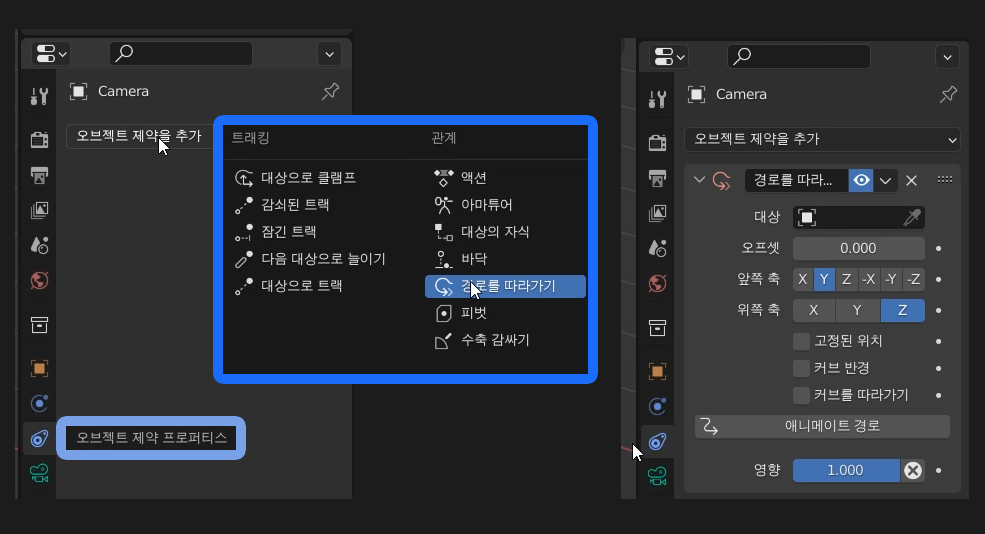 03. 오브젝트 제약 속성창에서 '오브젝트 제약을 추가'를 누르고 '경로를 따라가기(Follow path)'를 추가한다.