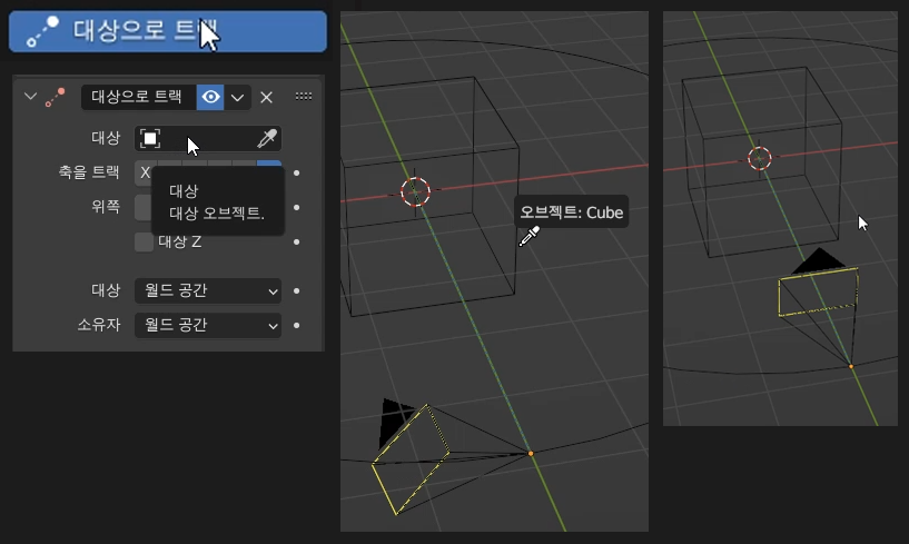 05. 다음으로 오브젝트 제약 중 '대상으로 트랙(Track to)'를 추가하고 대상을 리스트 중 선택하거나 아래 그림과 같이 스포이드로 원하는 대상을 콕 찝어서 선택하면 대상에 카메라가 맞춰진 것을 확인할 수 있다.