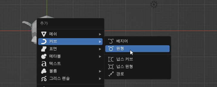 1. 수잔 원숭이가 있는 현재 스테이지에서, 추가(Shift+A)를 누르고 커브 - 원형을 클릭해서 원을 그려주세요. 필요한 경우 S를 누르고 크기를 조절하세요.