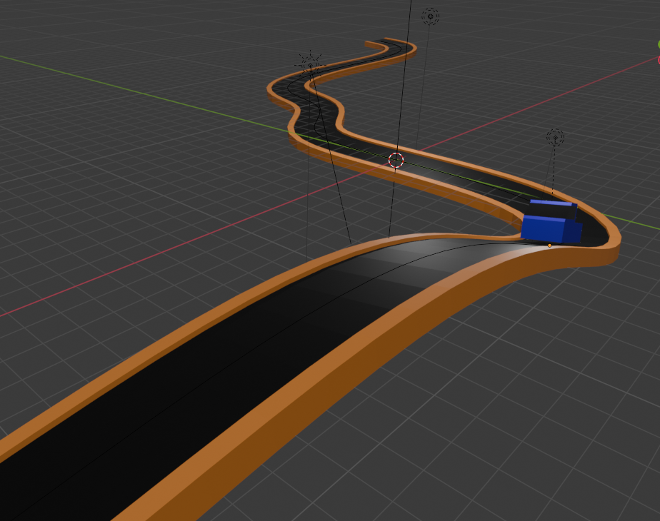 02. 차를 H키로 감추고 커브의 경로를 추가하고, 에디트모드에서 E를 누르고 그림과 같이 길을 연장해줍니다.