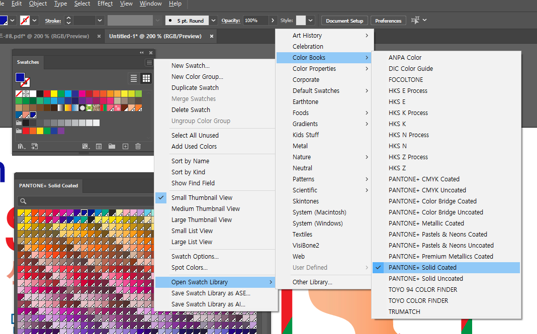 아래는 일러스트레이터에서 기본 제공하는 라이브러리에서 스와치스 라이브러리를 통해서 세계적인 팬톤컬러를 찾아서 적용하는 복잡한 메뉴의 로드맵입니다.