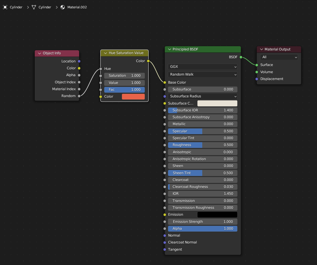 02. 파티클 조각을 선택한 후 기본색상 흰색 을 주고 쉐이더 에디터에서 Hue, Obj 를 키워드로 Hu/Saturation Value와 Object Info 노드를 추가해줍니다.