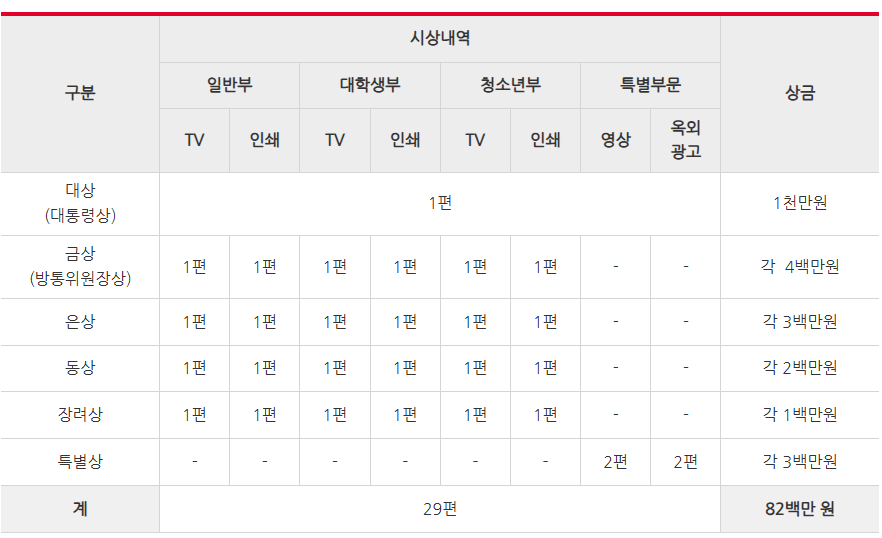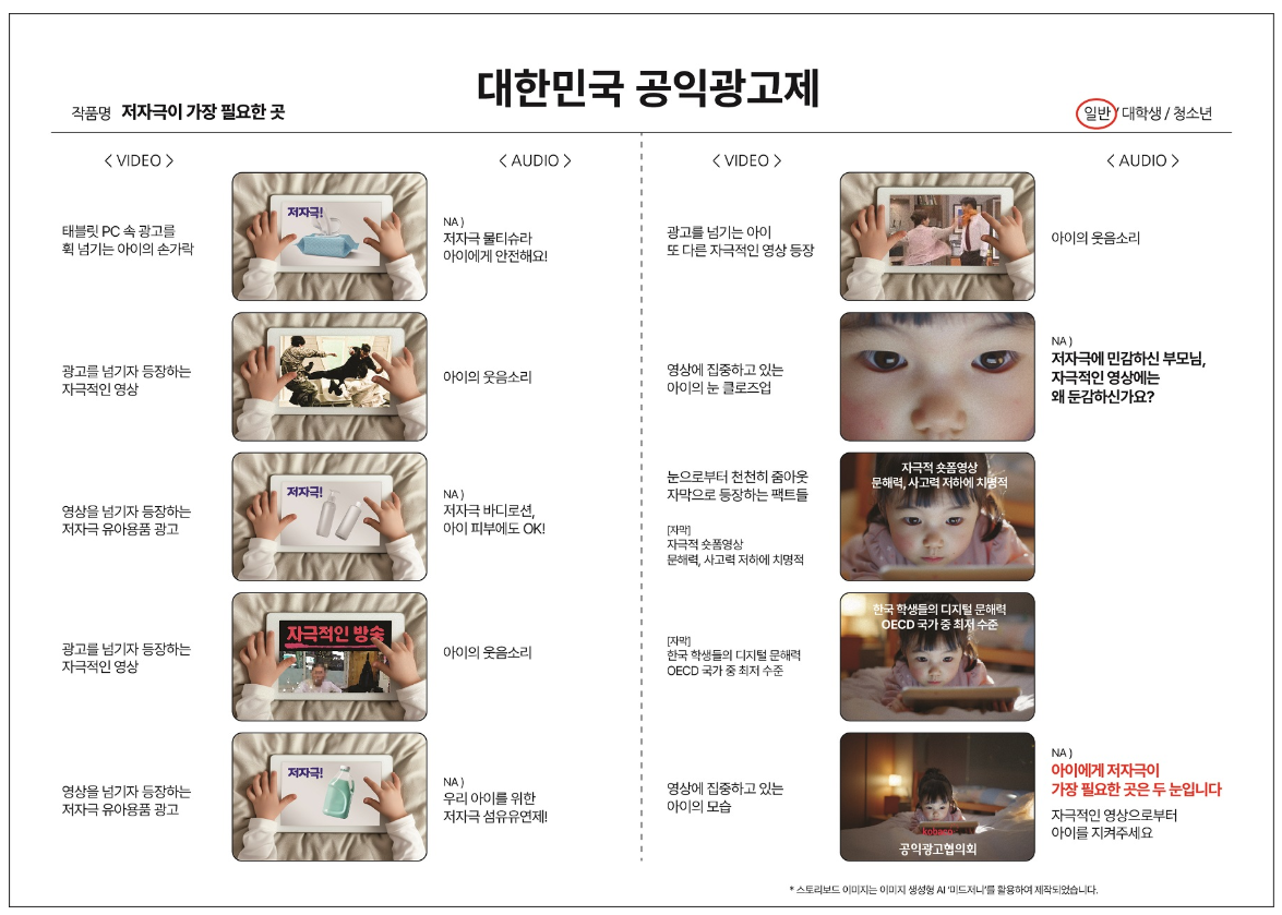 스토리보드는 영상제작에 아이디어를 제공하는 방송작가와도 같은 것입니다. 아래는 2021년 대상(대통령상)을 수상한 팀의 제목이 [예고편] 이라는 스토리보드에 기초한 공익광고입니다. 역대수상작 바로가기