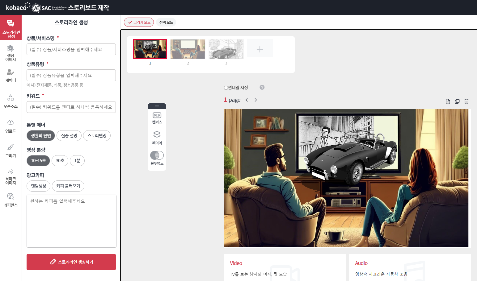 레이어구조를 열어 위아래 드롭다운해서 순서변경 가능하다. 인공지능을 활용하는 기능이 자체 탑재되어 있다. Video / Audio는 스토리보드의 핵심사항이니 꼭 어떤 내용이라는 것을 콘텐스트로 입력을 해야한다. 본인이 그린 그림을 업로드할 수 있는 기능 제공한다.