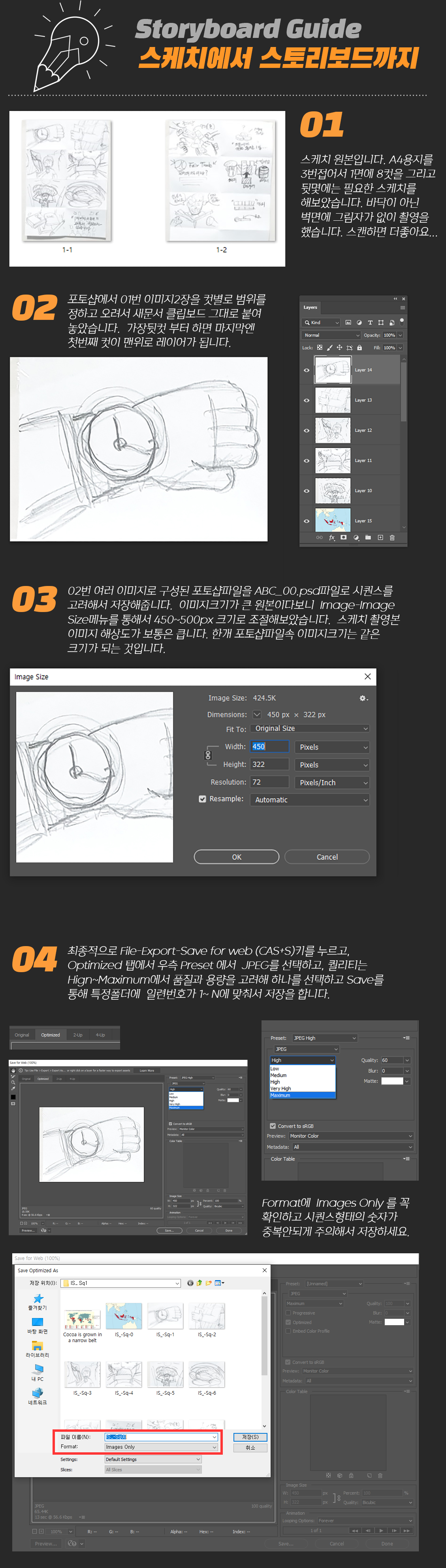 원본파일의 해상도는 300dpi 이상으로 설정하여 작업 후 온라인 출품시에는 72dpi 이상의 JPG 파일로 변환하여 제출. 스토리보드 양식에 맞추어 10컷 이내로 제작.(손으로 직접 그린 스케치본의 경우에 한함)