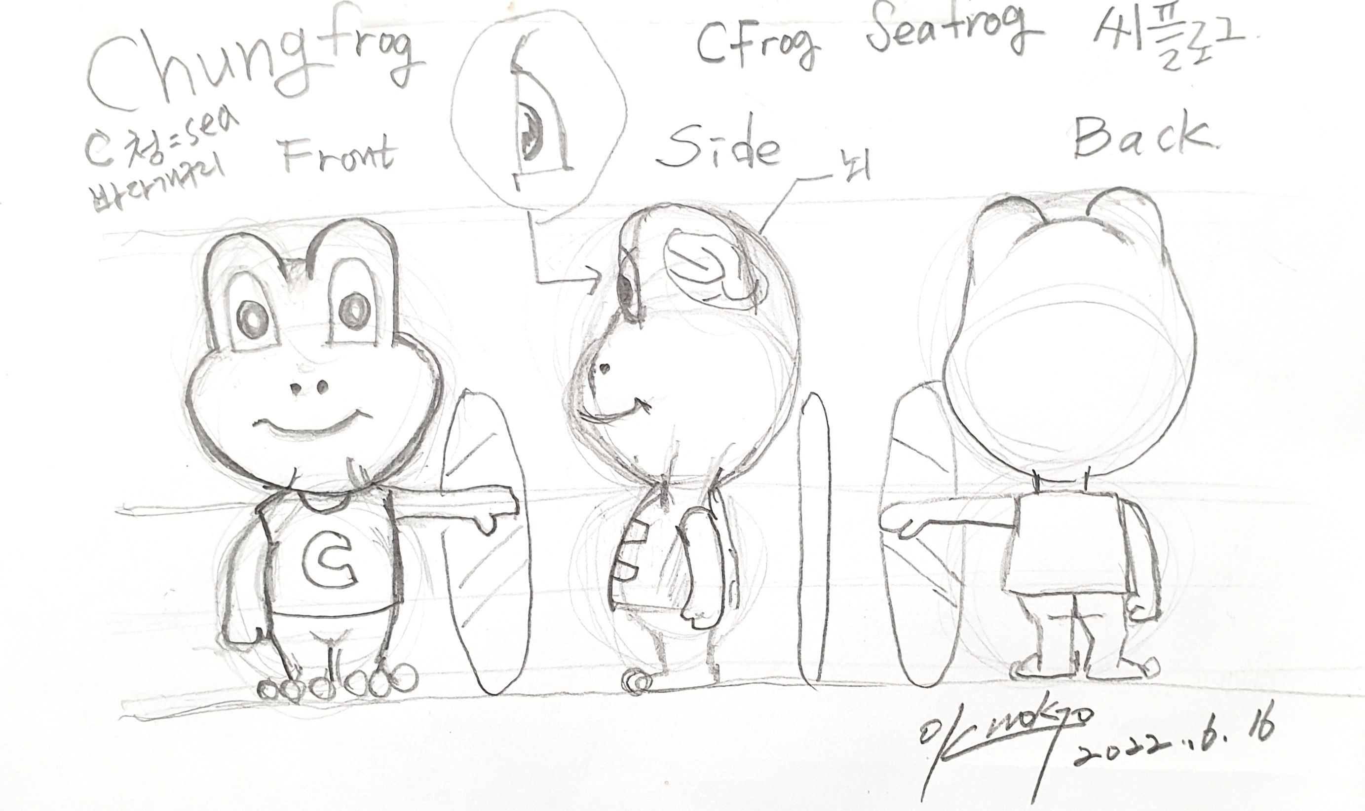 청개구리 캐릭터인데, Chung Gaguri는 아닌거 같고 Cfrog, Sea frog 중에서 적당한 작명이 필요하고 Sea에서 착안해서 서핀보드를 들고 있는 부분을 추가해보았다. 뒤에 이어서 그려본 인간이 하는 것을 따라하는 씨플록 스케치는 손가락으로 하트를 그리는 완성장면인데 사랑의 마음을 담아보았다. 스케치한 그림은 포토샵의 보정하고 일러스트레이터로 가져와서 트레이싱(아래 대고 위에서 베끼는)작업을 통해서 라인은 그리는 Path와 컬러링 작업을 해야한다.