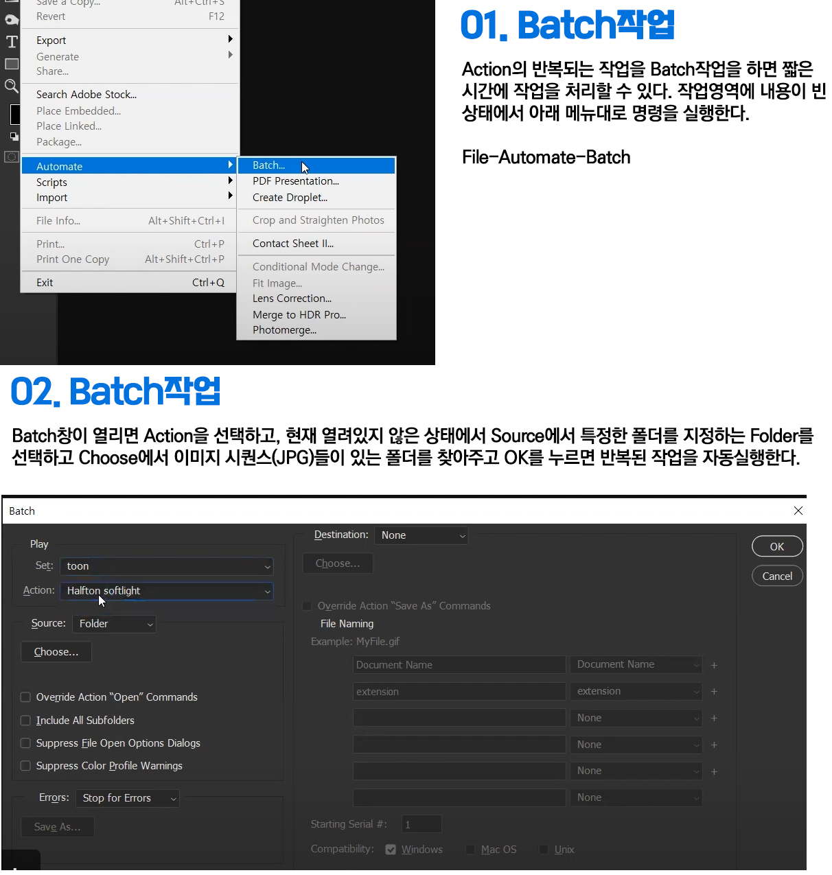 01. Action의 반복되는 작업을 Batch작업을 하면 짧은 시간에 작업을 처리할 수 있다. 작업영역에 내용이 빈 상태에서 아래 메뉴대로 명령을 실행한다. File-Automate-Batch / 02. Batch창이 열리면 Action을 선택하고, 현재 열려있지 않은 상태에서 Source에서 특정한 폴더를 지정하는 Folder를 선택하고 Choose에서 이미지 시퀀스(JPG)들이 있는 폴더를 찾아주고 OK를 누르면 반복된 작업을 자동실행한다.