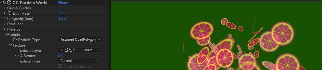 01. 녹색의 새 콤프를 만들어 주고 새로운 레이어로 C+Y를 통해 검은색 Solid Layer를 추가해주세요. Effects 검색창에 "CC Particle World"라고 검색해서 적용합니다.