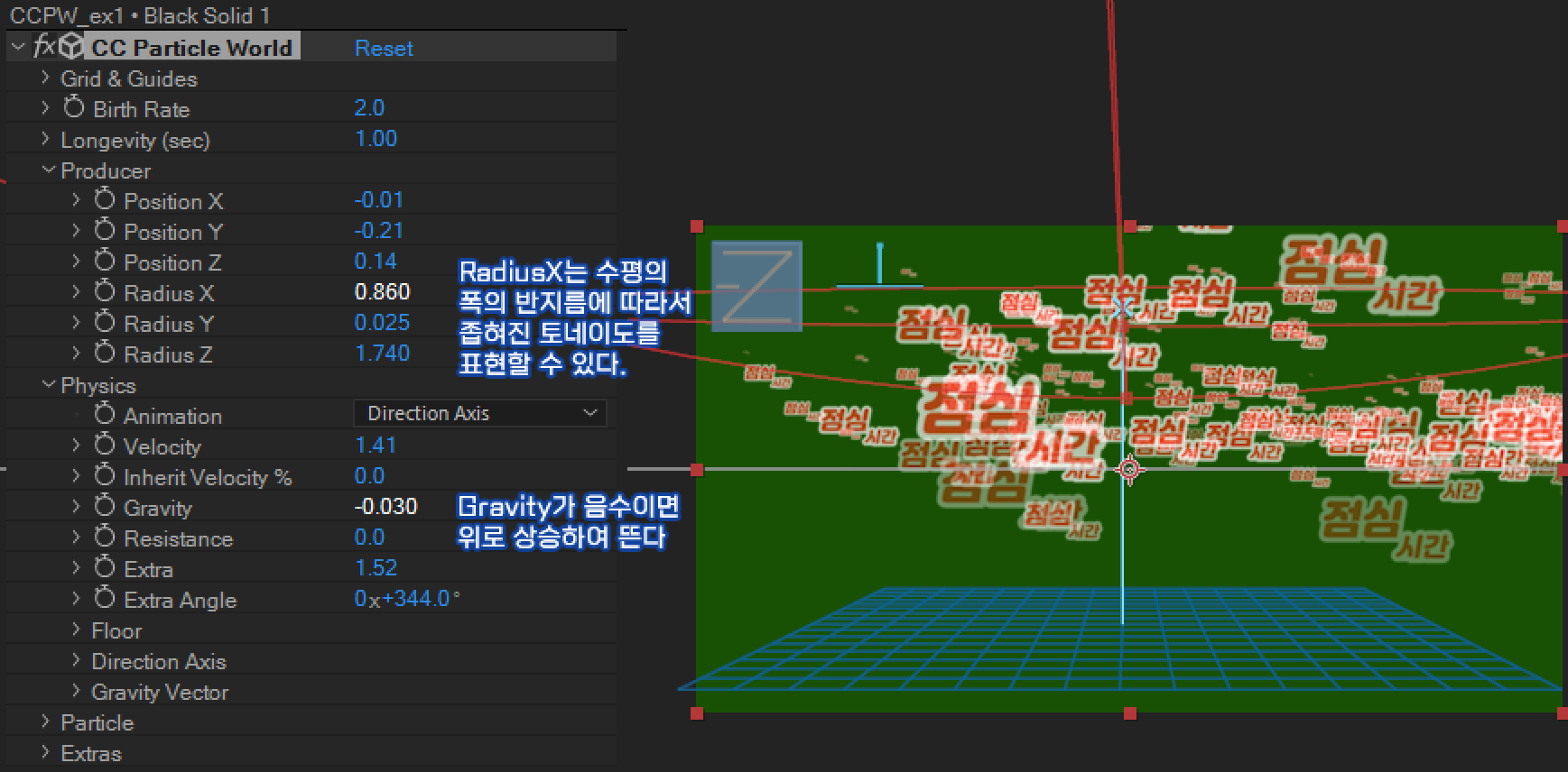 Direction Axis 로 설정 중에 Extra를 이용해서 입자의 방향을 상/하로 이동해 줄 수 있고 Gravity가 음수이면 위로 상승하여 뜬것처럼 표현됩니다. 입체적인 위치와 반지름값을 변화를 위해서 프로듀서에서 변화를 줄 수 있는데, RadiusX는 수평의 폭의 반지름에 따라서 좁혀진 토네이도를 표현할 수 있다.