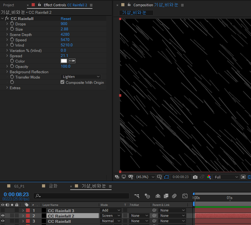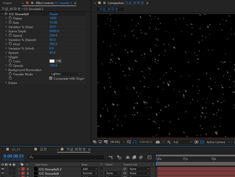 CC Rainfall과 CC Snowfall 효과 역시 Black 또는 Green 컬러 Solid에 효과를 주고 시각효과를 제작하여 동영상파일로 내보내서 효과에 적용할 수 있다.
