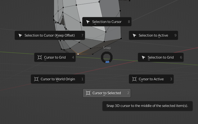 Origin to 3D Cursor : Edit Mode에서 정한 Curser to Selected에 중심을 맞춤을의미한다.