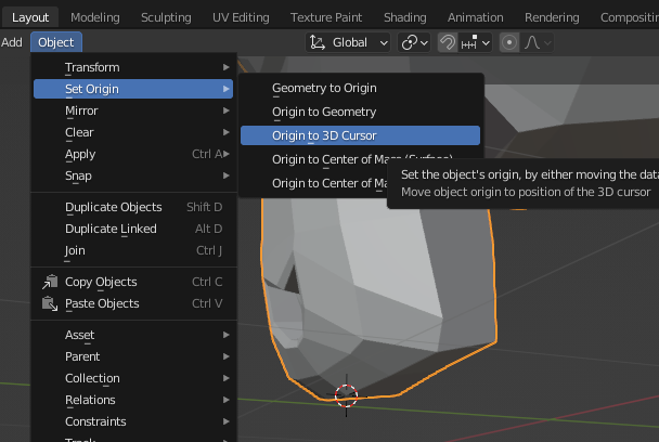 아래 그림과 같이 메뉴가 아닌 우클릭(RMB)후 Set Origin ▶ Origin to 3D Cursor를 통해서도 적용가능하다. CAS+C는 단축키 이다