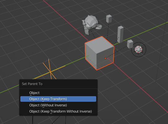 순서가 있다. 먼저 자녀역할을 하는 오브젝트(들)을 선택하고Shift 키를 누르며 부모역할할 대상을 마지막에 선택한 후Ctrl+P를 누른 다음에 항목에서 Object(Keep Transform)을 선택하면 마지막 오브젝트를 움직이거나 회전, 이동시 자식들은 영향을 받는다. 물론 자식들을 하고 싶은 변형(Transform)을 할 수 있다.