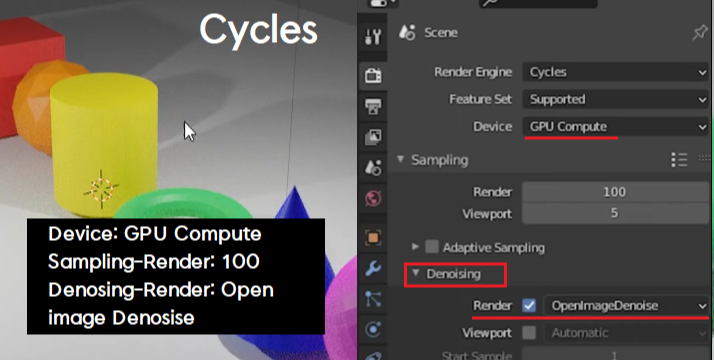 스틸이미지의 퀄리티를 사진같이 보여주는 Cycles는 먼지같은 입자인 노이즈와 속도가 문제이다.스틸사진을 위한 Cycles의 경우 기본 Render Device: GPU Compute / Sampling - Render: 100 / 노이즈 감소를 위한 Denosing -Render: Open image Denosise를 선택하고 적용하는 많이 알려진 팁도 있었다. 마찮가지로 점검할 옵션들이 복잡해서 아래그림을 참고해야 할 것 같다.