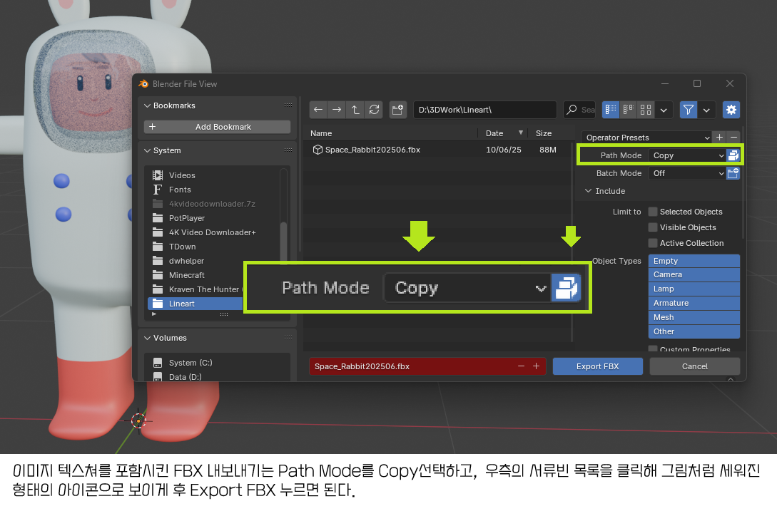 단, 캐릭터에 포함된 재질을 포함해서 FBX로 내보낼 경우는 첫번째로 오른쪽 옵션에서 Path Mode에서 Copy를 지정하고 옆에 있는 서류함 모양 버튼을 클릭합니다. 두번째로 Include에서 Selected Object를 체크한 후 내보내야 합니다.