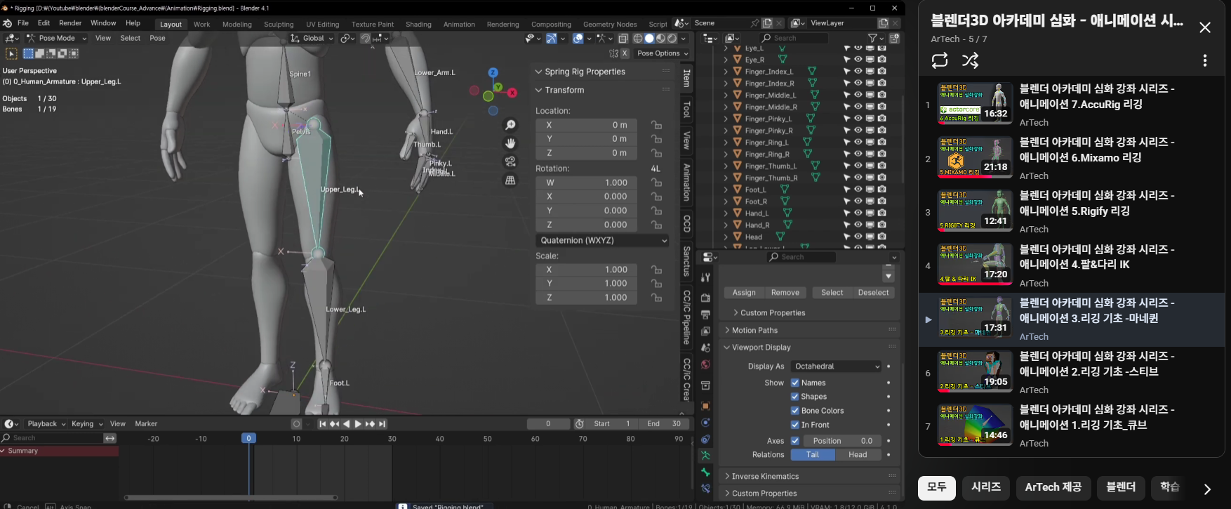 Blender의 다양한 캐릭터 리깅의 전문적인 지식을 원하는 분들은 ArTech 블렌더3D 아카데미 심화 - 애니메이션 시리즈를 추천하는데 마야와 같은 3D그래픽의 지식이 풍부한 강사님의 7편으로 구성되었습니다.