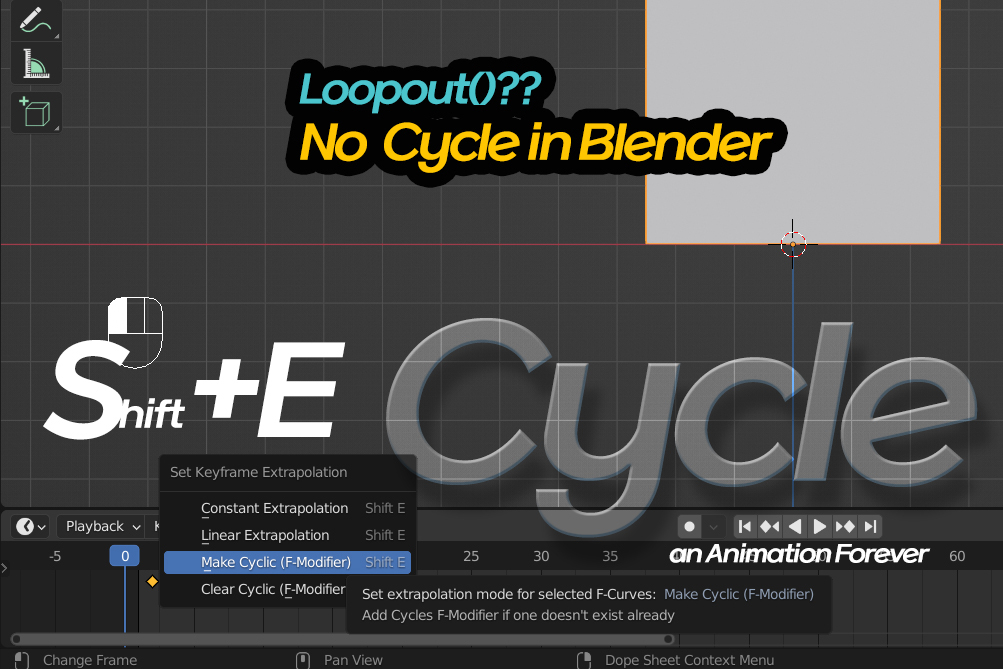 반복되는 LoopOut()이라는 표현식이 있는 애프터이펙트와 동일한 기능을 블랜더에서는 Cycle이라 합니다. 키프레임 애니메이션을 개별적으로 3개로 구분하여 표현하고 타임라인에서 해당된 키프레임을 선택한 후 Shift+E를 누른 후에 Make Cycle을 선택하면 반복되는 애니메이션을 개별적으로 줄 수 있습니다.