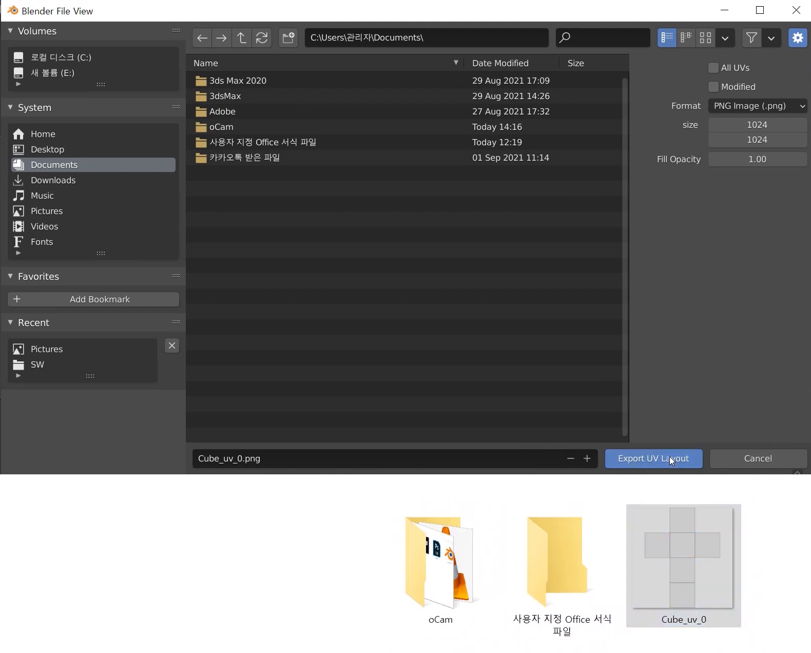 아래 그림과 같이 Export창이 뜨면 우측의 Fill Opacity를 1.00정도의 선명하게 불투명도를 지정하고 하단의 Export UV Layout 버튼을 눌러서 PNG파일로 맵소스를 내보낸다. 아래 그림의 오른쪽 윗 부분의 이미지는 PNG 이미지포맷으로 지정하고 Size는 정사각 박스형상의 비율을 유지하고 기본이 1024px이지만 더 해상도가 큰 이미지로 2000, 혹은 4000으로 지정하면 더 좋은 품질의 렌더링 결과물을 볼 수 있습니다.
