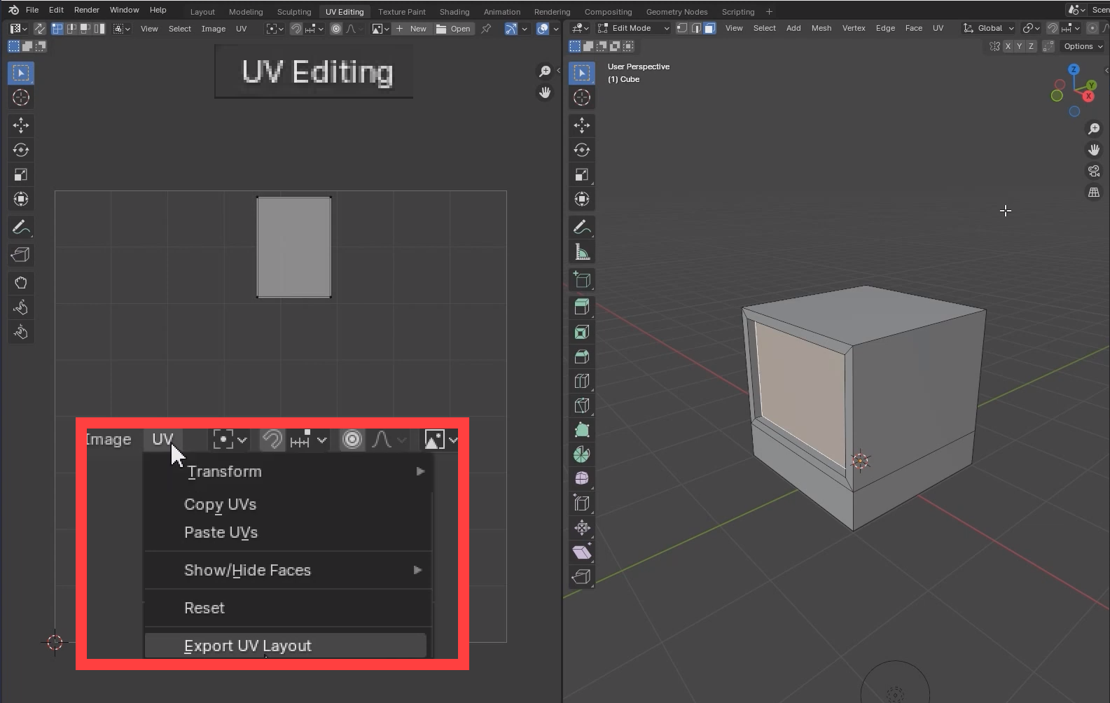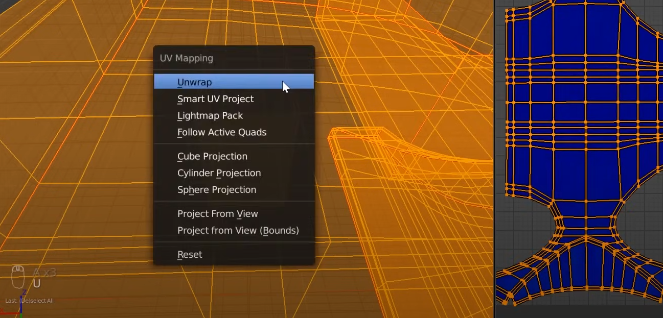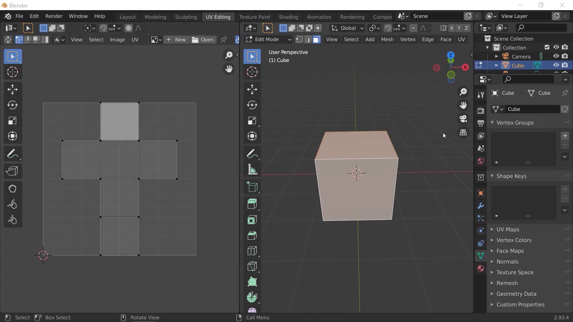 01. 기본 Layout 작업공간에서 오브젝트를 선택하고 Edit Mode에서 상단의 Layout 작업공간을 UV Map을 변환시키면 다음과 같은 양쪽으로 구분된 레이아웃을 만난다. 선택한 전체(A)면이 펼쳐진 맵을 왼쪽에서 볼 수 있다.