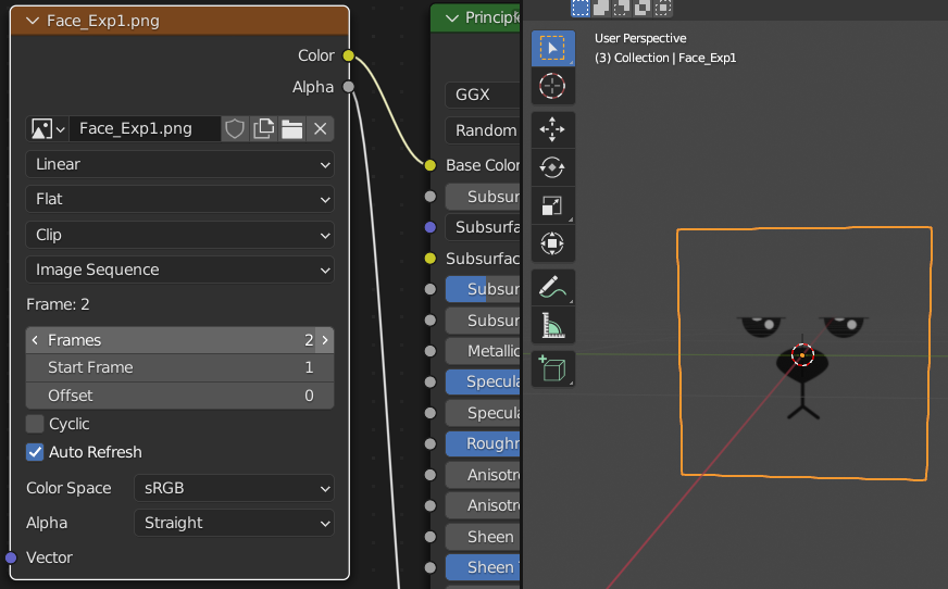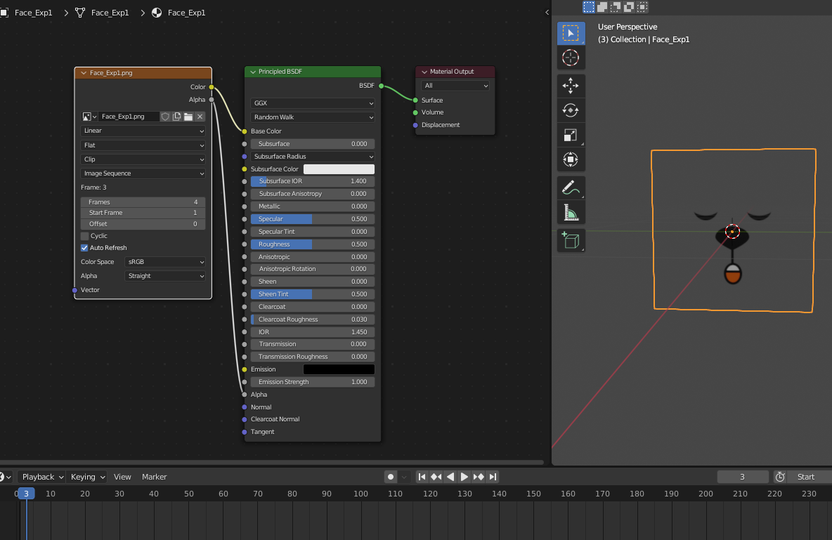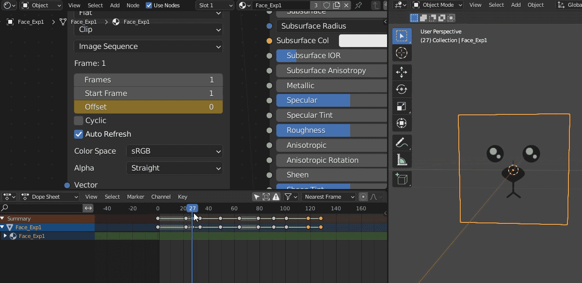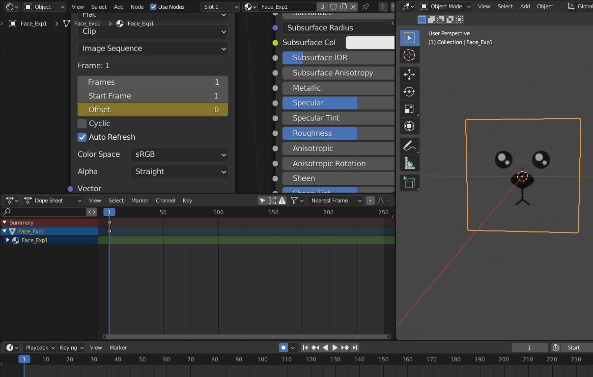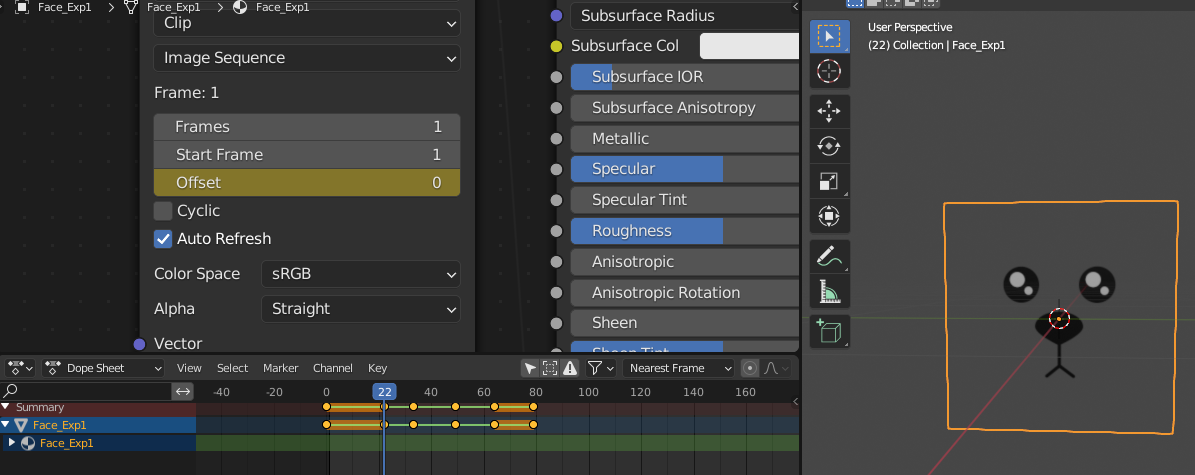 Face_Exp1.png패널 중 Clip밑 Sigle을 Image Sequence로 변경 후, PNG항목의 열기버튼으로 현재 이미지 포함해서 시퀀스 이미지들을 모두 선택해 열어준다. 그러면, Frames는 이미지 갯수만큼 다수로 보인다. ex) 5 > 5Frame 이 되며 타임라인에서 확인할 수 있다.