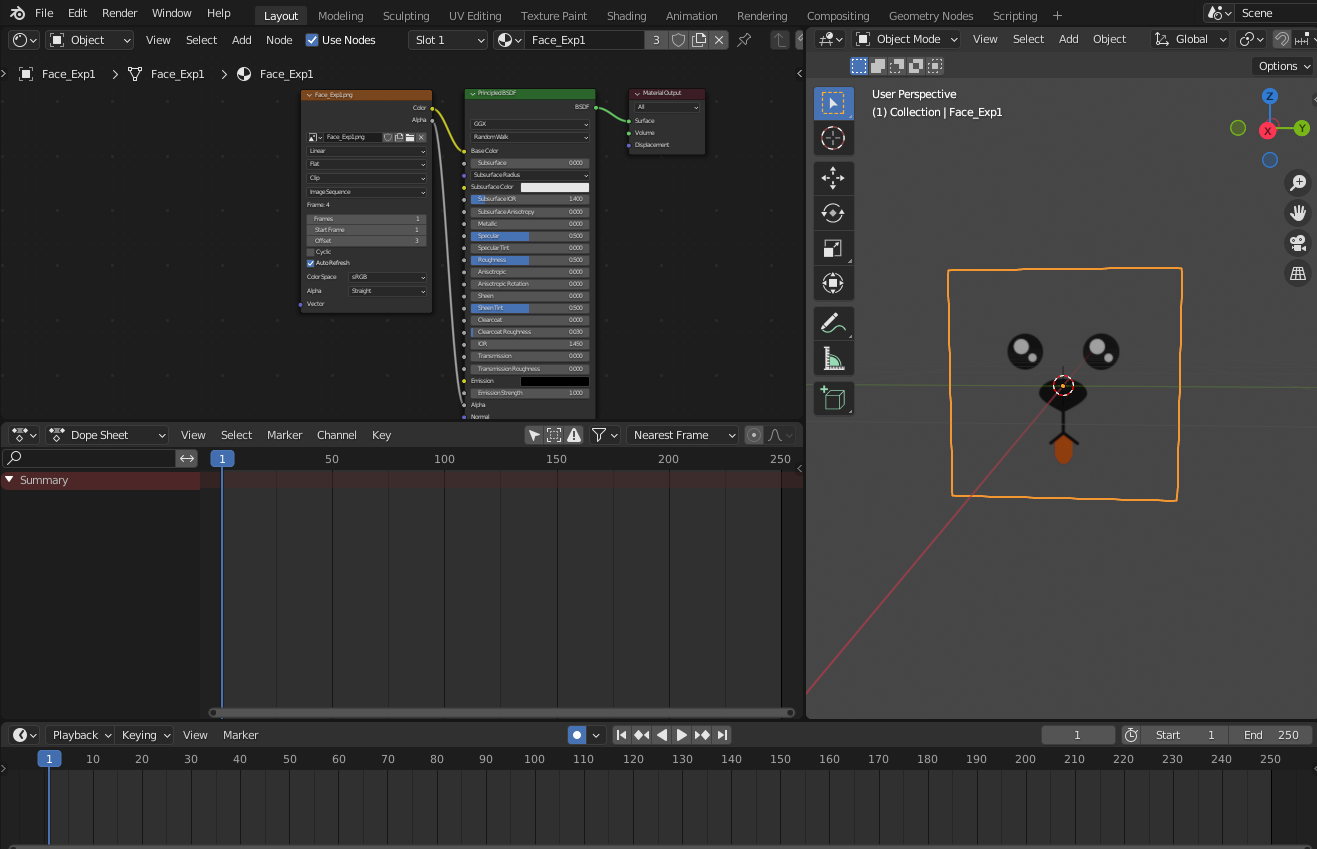 표정평면 에디트모드에서 우클릭후 Subdivide 적용(면 홀수로 증가 5,7,9)한다. 오브젝트 모드 표정에 모디파이어 Shrinkwrap 적용하고 Target을 아이드롭퍼로 큰거(섭디비전 표면 Ctrl+4넘패드가 아닌 숫자 6)Offset을0.03m 정도 주면 자연스럽게 붙는다.