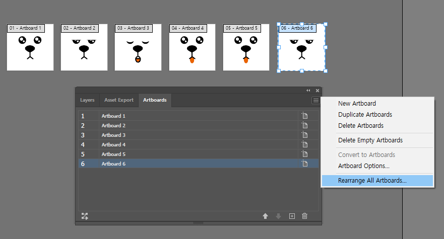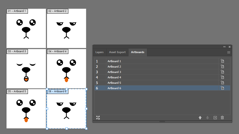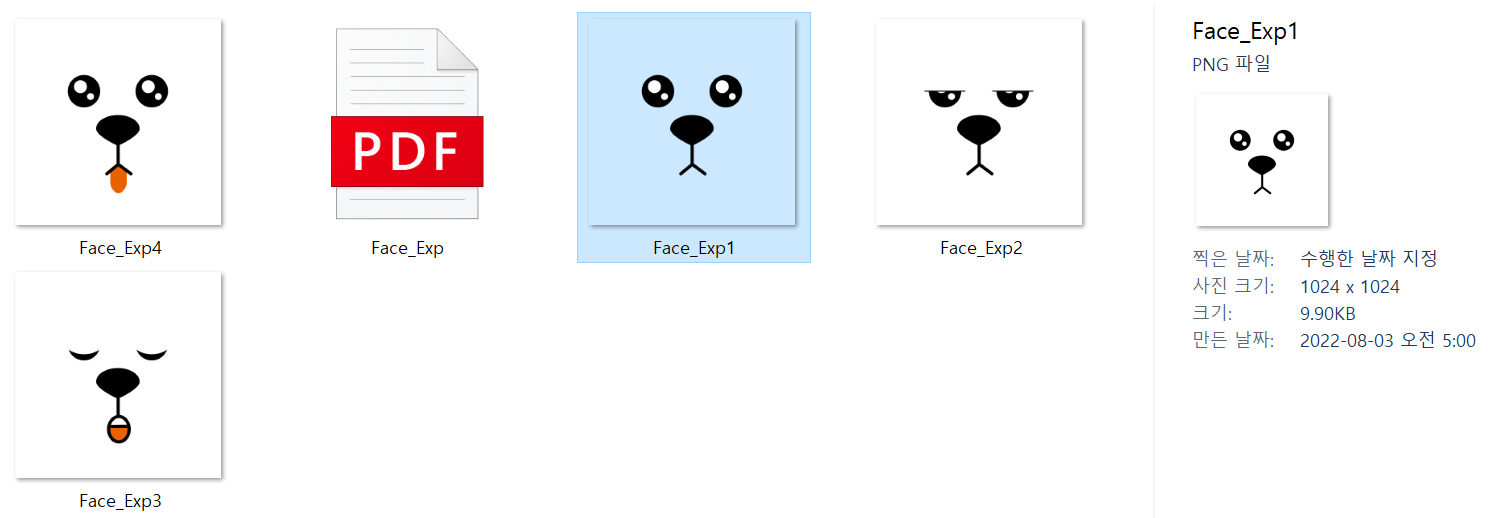 아래와같이 3D캐릭터의 표정모양의 형상을 대신할 2D 얼굴표정을 일러스트레이터에서 별도의 작업을 진행하는 작업이 필요합니다.