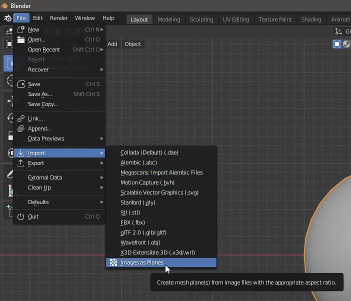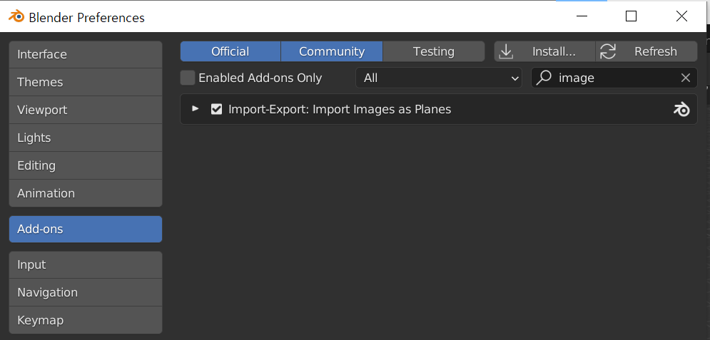 본 작업전에 Edit-Preferences 메뉴에서 Add-ons의 " Image"검색을 통해 아래 그림과 같이 Import-Images as Planes을 체크해서 활성화 시켜놓고 진행해야 한다.